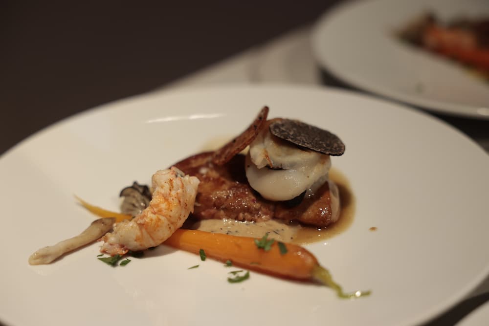 « Sur une escalope de foie gras cuite, des noix de St-Jacques sautées seront déposées, émincées et alternées de lames de truffe fraîche. Entourer le tout d’une huître pochée, d’une langoustine poêlée, d’un couteau portionné et d’une carotte fane glacée. Accompagner cette préparation d’une fine purée de topinambour truffée et quelques chips de pomme de terre de Noirmoutier. Une sauce truffée viendra terminer cette assiette. »