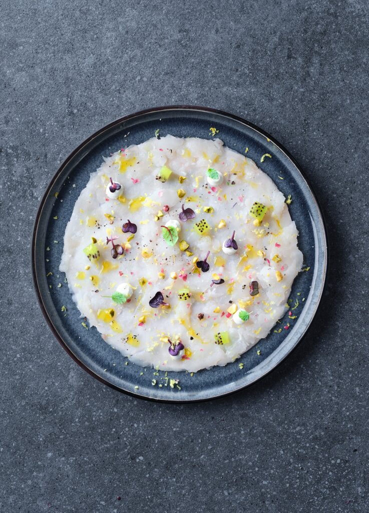 Préparer le carpaccio: Démoulez le carpaccio de cabillaud sur l’assiette 10 minutes avant de servir pour le laisser revenir à température ambiante.