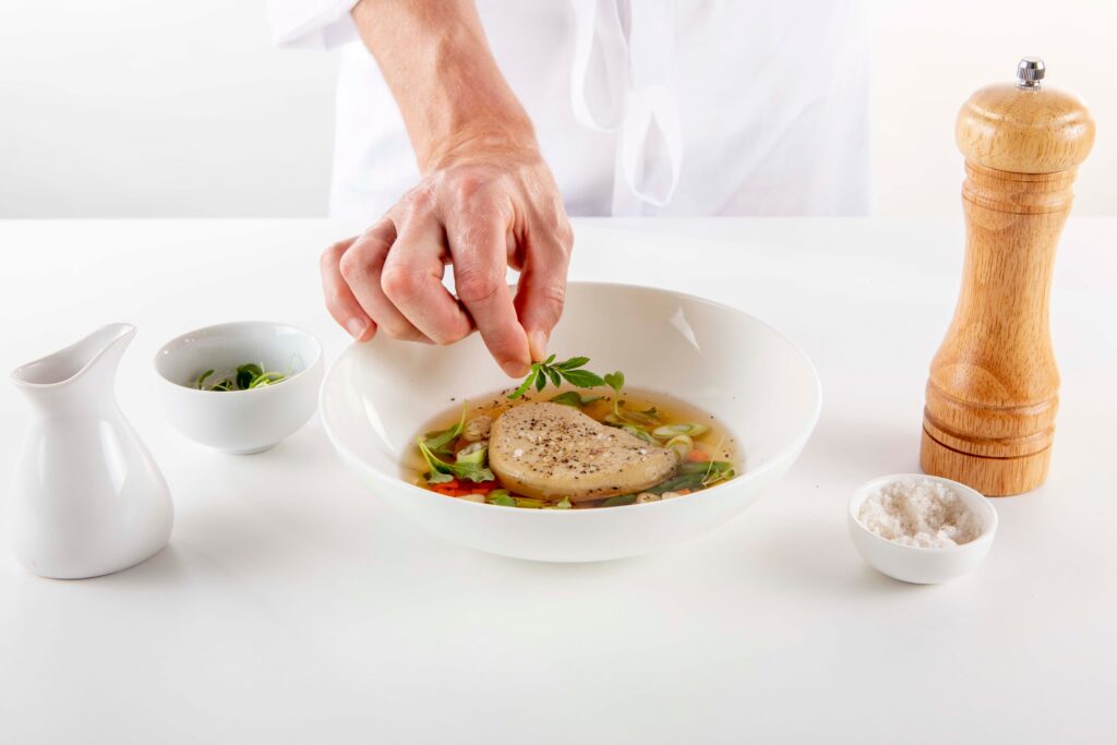 Pocher les escalopes: Dans le bouillon chaud, plongez les escalopes colorées et laissez-les pocher pendant 10 minutes à 70°C.