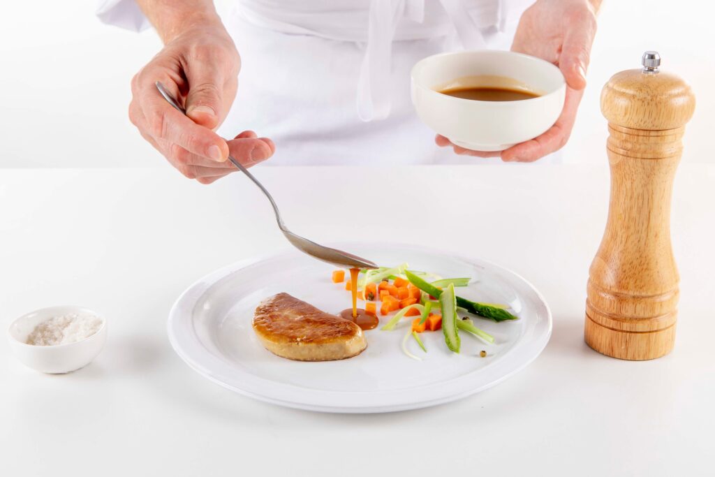 Dresser l’assiette: Disposez les légumes dans l’assiette, ajoutez l’escalope de foie gras poêlée et nappez de la sauce réduite aux tomates.