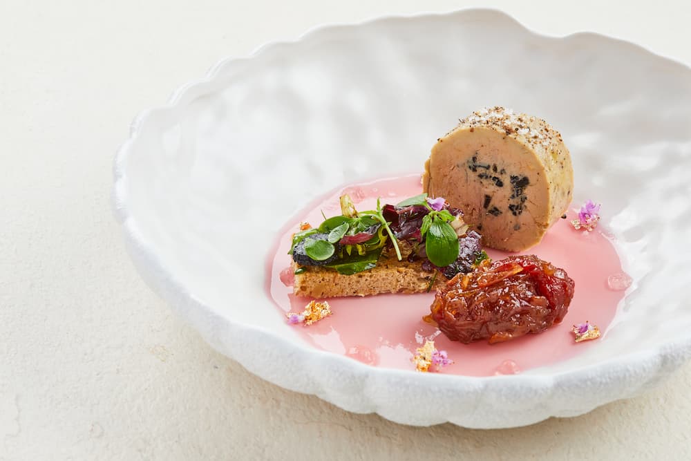 Foie gras d’oie entier du Sud-Ouest truffé, chutney échalotes raisins, gel de champagne rosé & tartine végétale