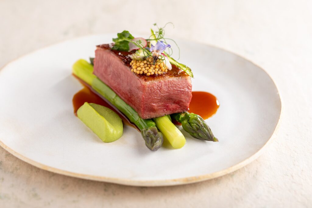 Accueil / Recettes / Plats de chefs / Magret de canard poêlé, asperges vertes et graines de moutarde