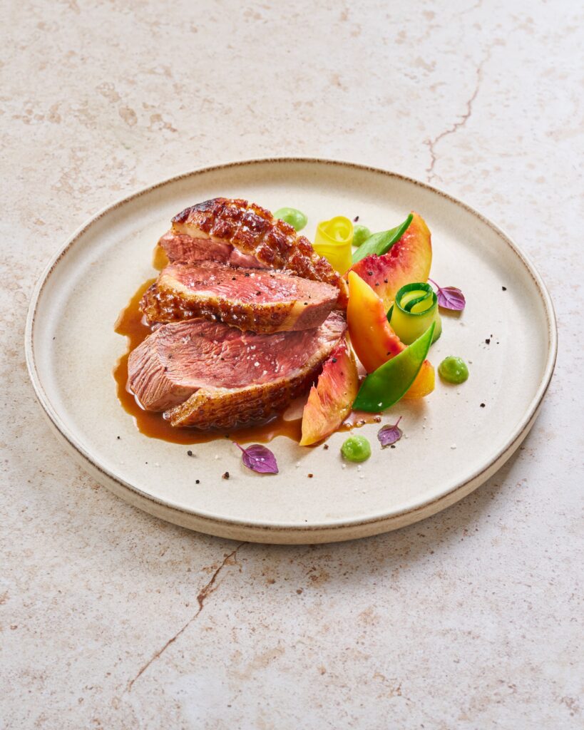 Accueil / Recettes / Plats de chefs / Magret de canard rôti à la pêche et légumes d’été
