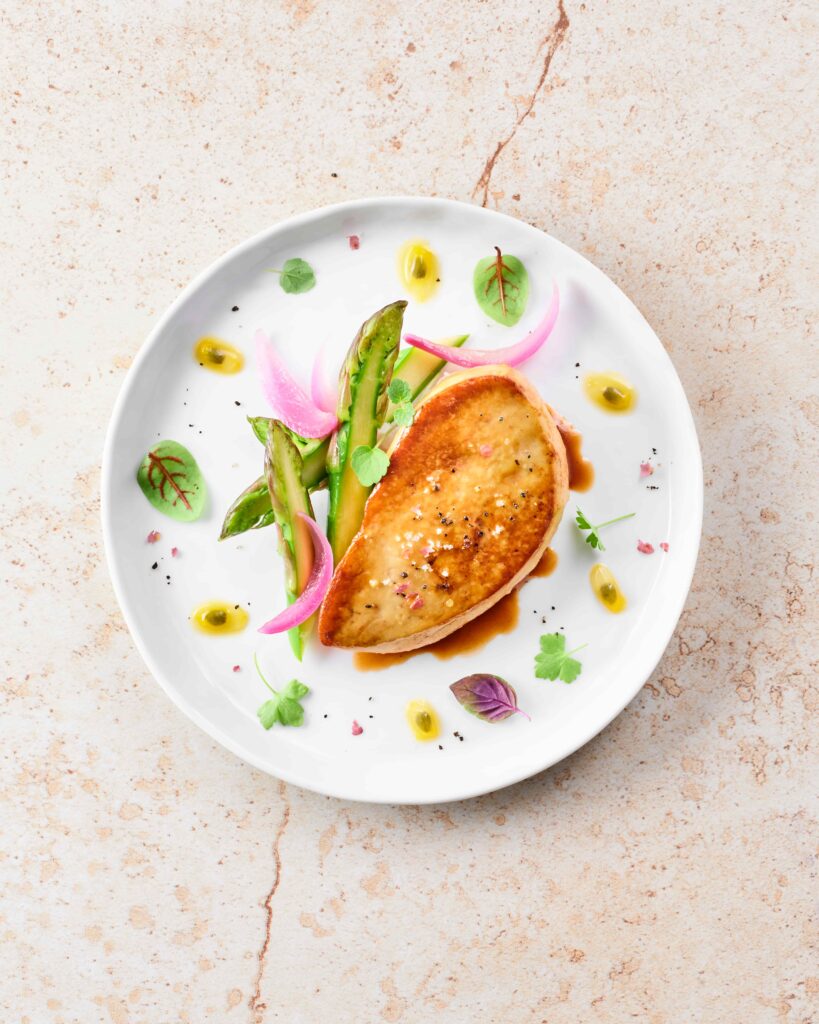 Discover this refined recipe for pan-seared foie gras escalope, enhanced by a reduced duck jus and accompanied by delicately marinated spring vegetables.