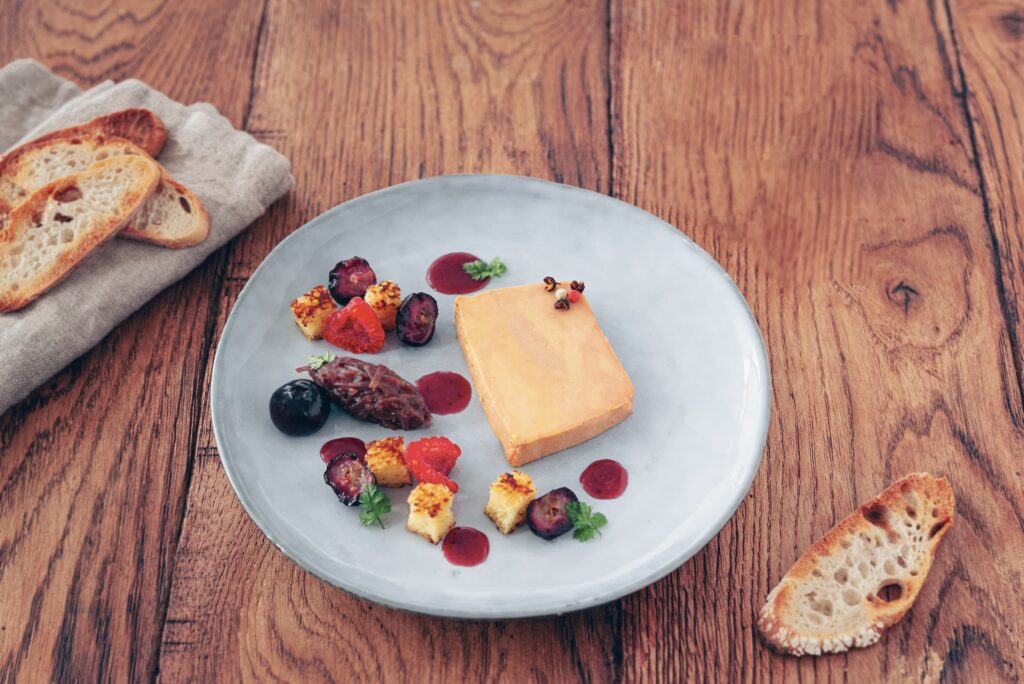 Montar los platos: Disponer armoniosamente las rebanadas de foie gras, las frutas rojas y los cubos de brioche en cada plato, luego agregar un toque de zumo de arándanos reducido para el toque final.
